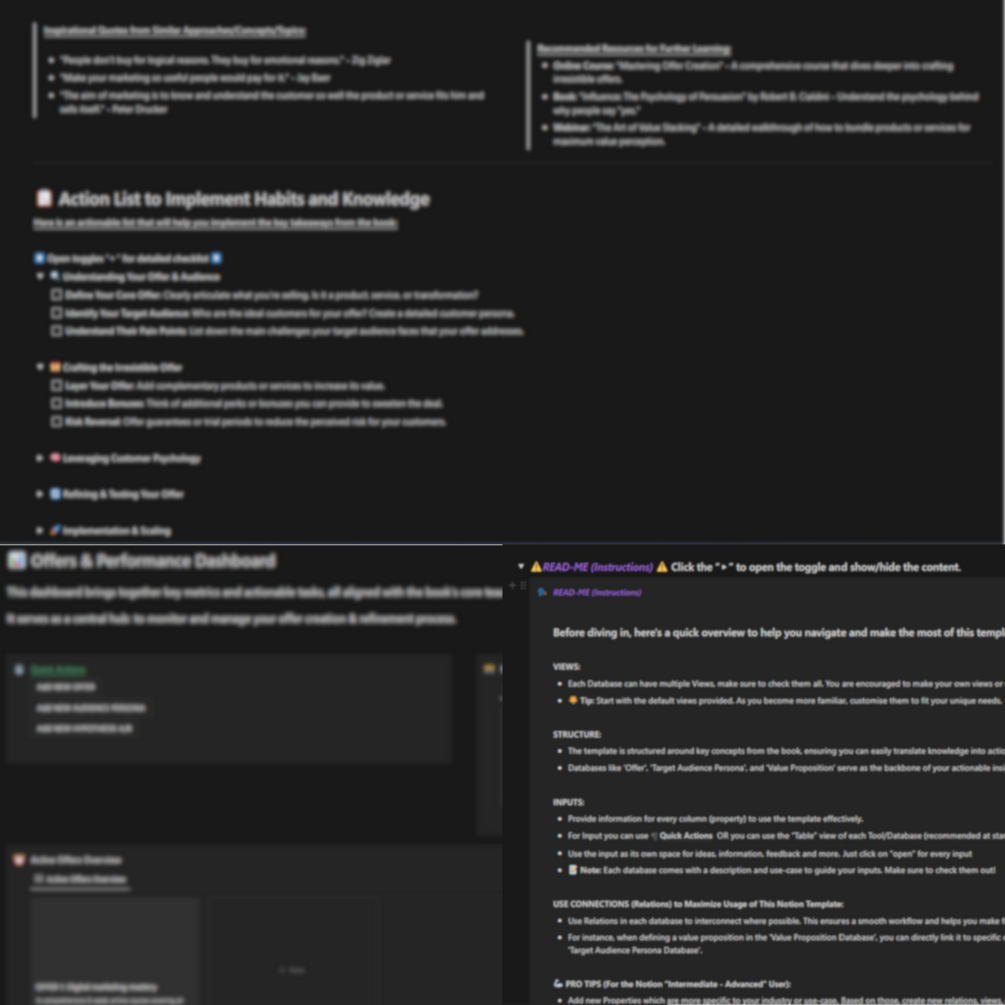 You'll obtain a meticulously crafted summary focusing on the book's main concepts and actionable insights, all organized within an intuitive Notion template. This guide is enriched with motivational sections, practical implementation tools, and extensive checklists, designed to facilitate the integration of knowledge into your daily life.