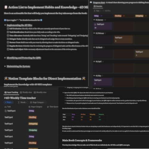 You'll obtain a meticulously crafted summary focusing on the book's main concepts and actionable insights, all organized within an intuitive Notion template. This guide is enriched with motivational sections, practical implementation tools, and extensive checklists, designed to facilitate the integration of knowledge into your daily life.